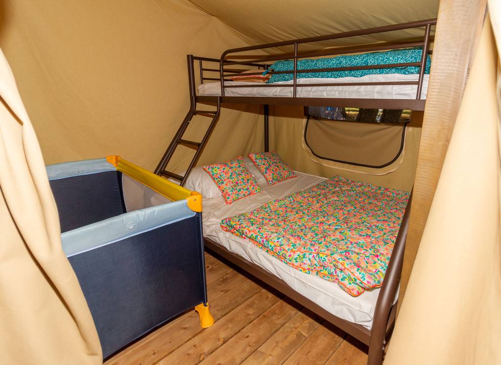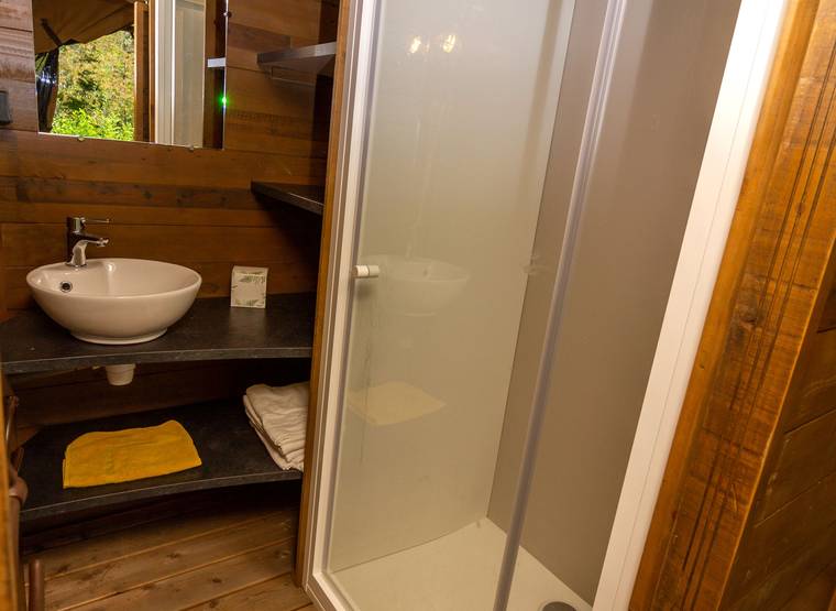 Lodging tents on stilts for 5 people with kitchen and bathroom and a breathtaking view of the river.