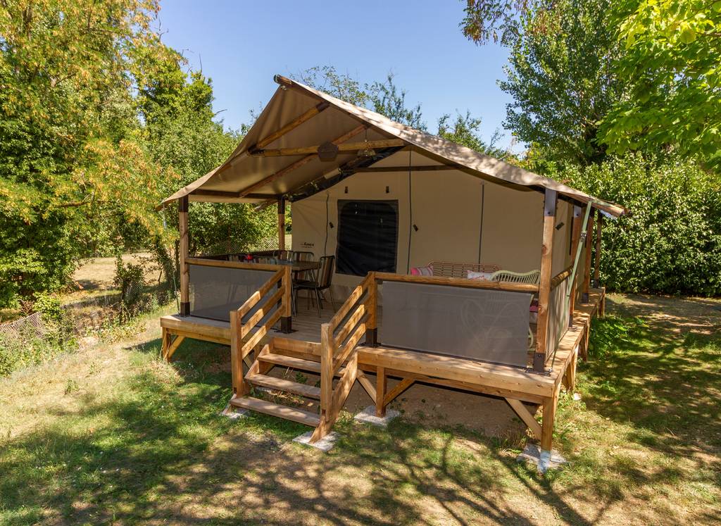Atypical, family-friendly campsite***. Shady park with direct access to our river beach "Le Doux". The 5 lodge chalets offer natural charm, a Safari atmosphere, the spirit of nature and added comfort.