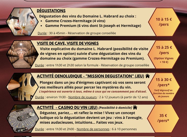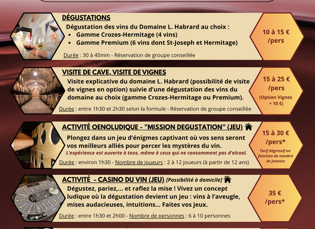 Différentes prestations sont proposées, au domaine Laurent Habrard à Gervans ou à domicile (en fonction de la prestation) : de la simple dégustation à la visite de cave et de vignes en passant par des ateliers "initiation à la dégustation" ou encore des activités plus ludiques et conviviales comme le "Casino du vin" (idéal à partager entre amis ou en famille).