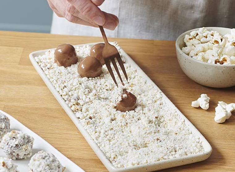 Originales et croquantes, les truffes “pop corn” associent la douceur du chocolat et le croustillant du maïs soufflé caramélisé.