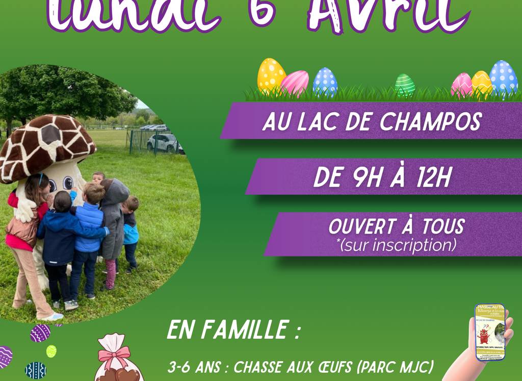 Participez à une chasse aux oeufs en famille au Lac de Champos pour les 3-6 ans. Des cadeaux et de nombreux jeux vous attendent ! Sur inscription.