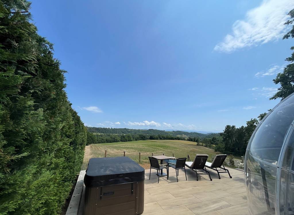 Terrasse avec spa privatif, vue sur le Vercors
