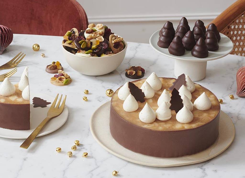 • Bûche de Noël poire, pécan et ganache montée chocolat noir Caraïbe, alliant fraîcheur fruitée, croustillant et intensité chocolatée.