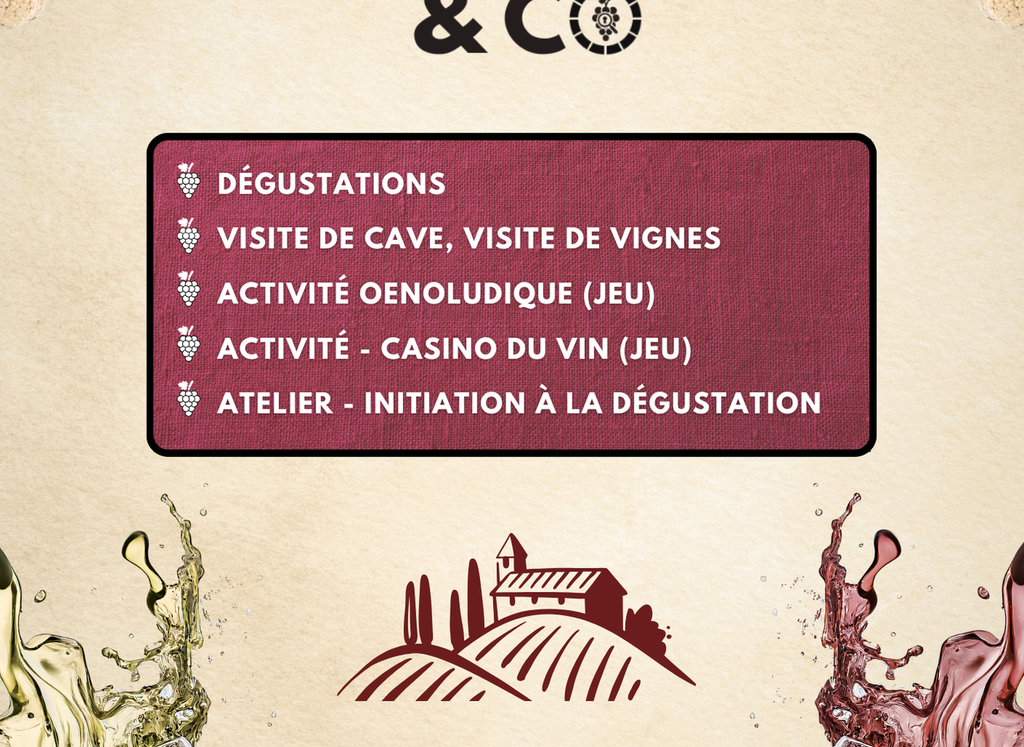 - Activité « Casino du vin » : Dégustez, pariez, ... et raflez la mise ! Vivez un concept ludique où la dégustation devient un jeu : vins à l’aveugle, mises audacieuses, intuitions... Faites vos jeux ! (de 6 à 10 personnes, 35 €/pers) [Possibilité à domicile].