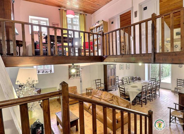 Rez de chaussée: Entrée, salle à manger avec cuisine intégrée, salle de bains et wc séparés, grande salle de 60 m² avec cheminée, coin-salon avec canapé,