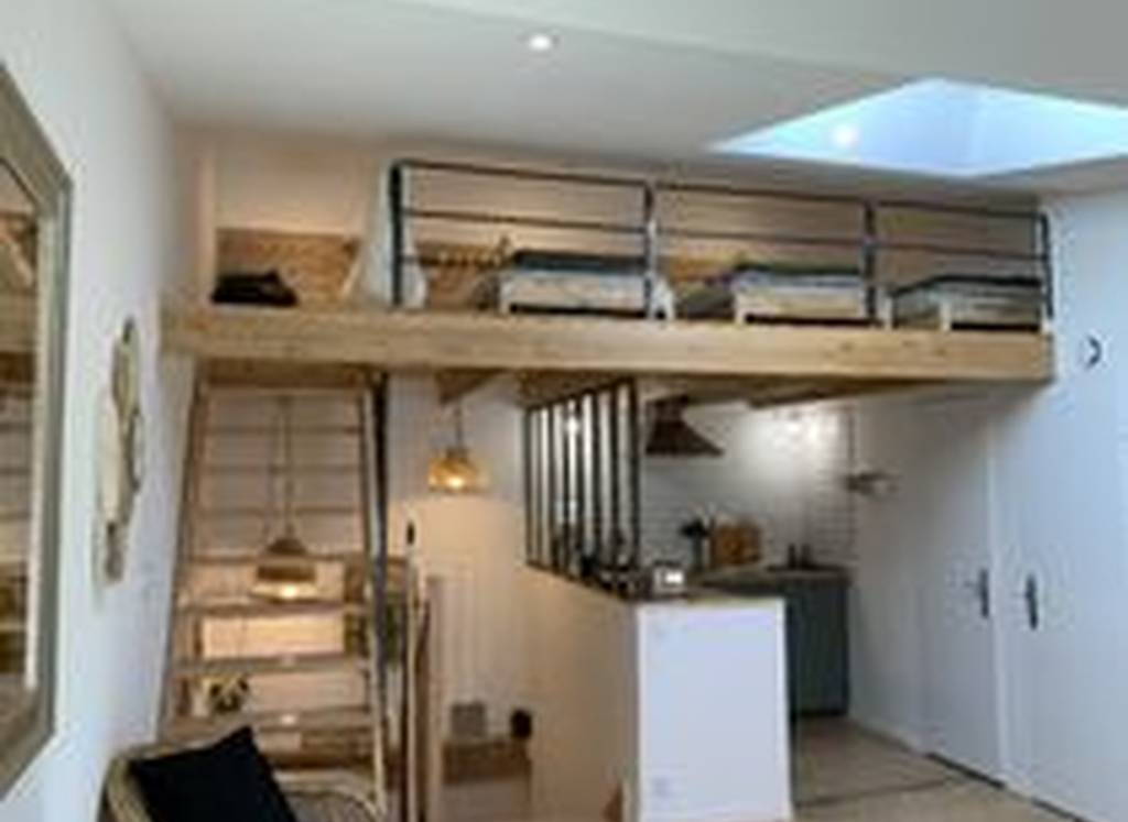 Un studio pour 4 personnes comprenant un lit pour 2 personnes sur estrade et 2 lits une personne superposés sur mesure dans un coin nuit .(idéal pour une famille avec 2 enfants). 2e étage
