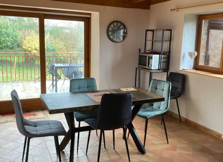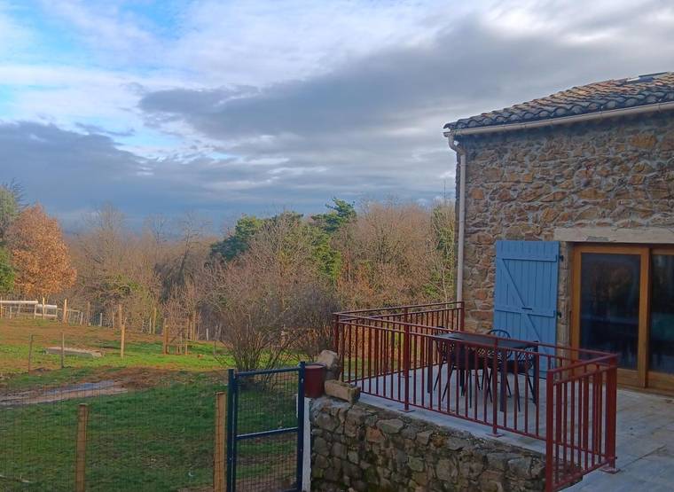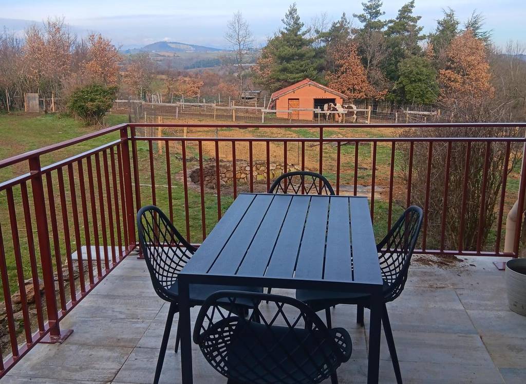 Le gîte bénéficie également d'une terrasse privative avec petit espace vert clôturé et vue sur le parc à chien, les chevaux et les monts.