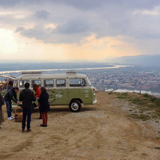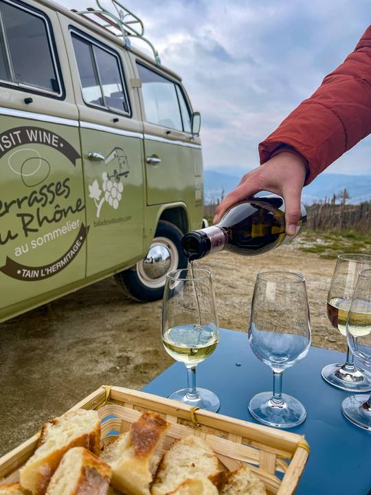 La balade en Combi Vintage dans les vignes sur la colline de l’Hermitage avec dégustation de 3 vins et d’une planche de charcuterie et fromage. Durée 1h.